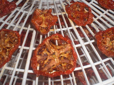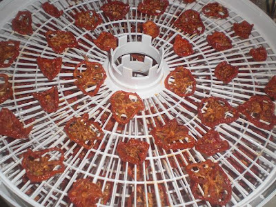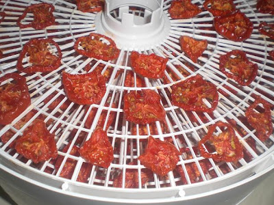 – Slice the tomatoes to about 1/4″ thick. Arrange the slices on the dehydrator trays. Sprinkle lightly with salt and pepper and any other spices you’d like to add.