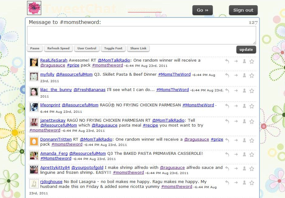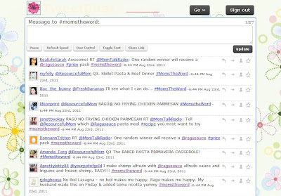 | Here’s an image from when I used TweetChat for a MomSelect-hosted, Ragu-sponsored Twitter Party. Click image to view larger. |