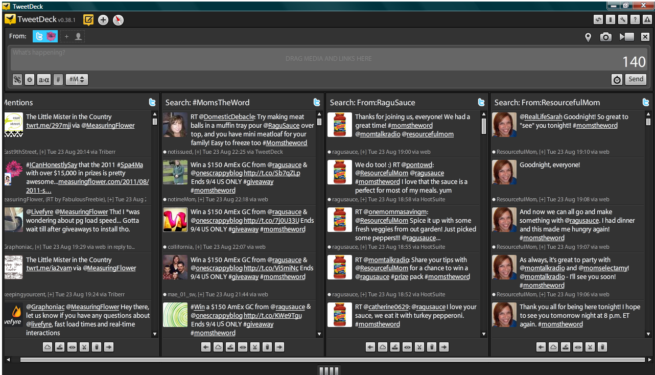 | Here’s an image from when I used TweetDeck on the desktop for a MomSelect-hosted, Ragu-sponsored twitter party. I had a column for each host, the hashtag, and my @ Mentions so I could keep up with everything at once. Click image to view larger. |