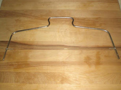 – Cake leveler. This takes the guesswork out of using a serrated knife to level a cake. You adjust the height of the wire cutting edge then cut the domed top off a cake using a sawing motion.