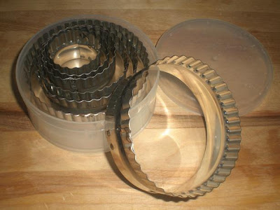 – Round cookie cutter. These are awesome. They come in all different sizes, they have a smooth and a fluted side, and they have a plastic container to hold them. Good for cookies, biscuits, and more.