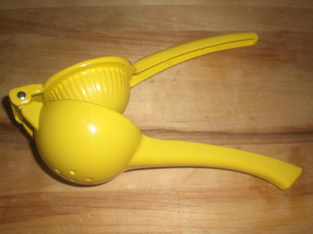 – Lemon squeezer. This is a really cool tool. You place half a lemon in it and bring the handles together. It turns the lemon half inside-out to squeeze out the maximum amount of juice. It also keep seeds from escaping.